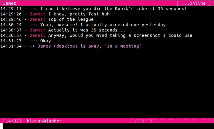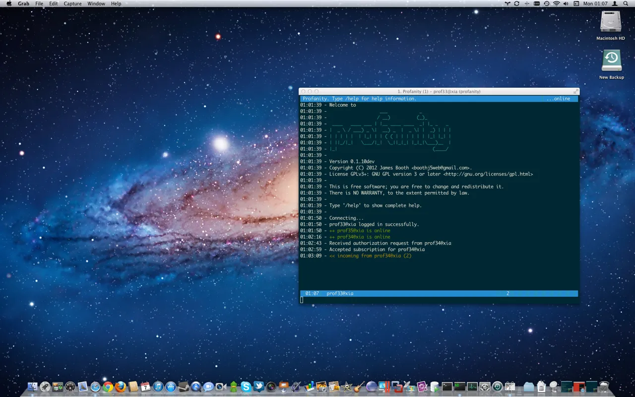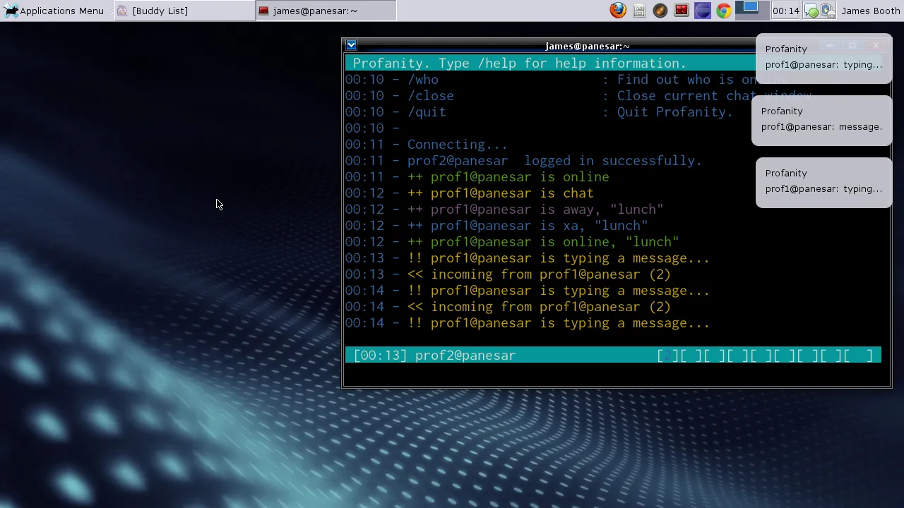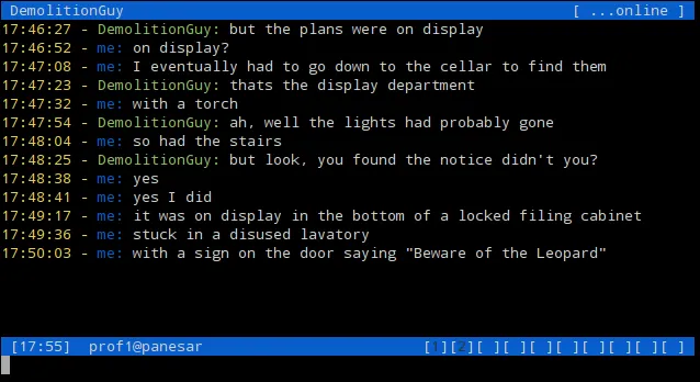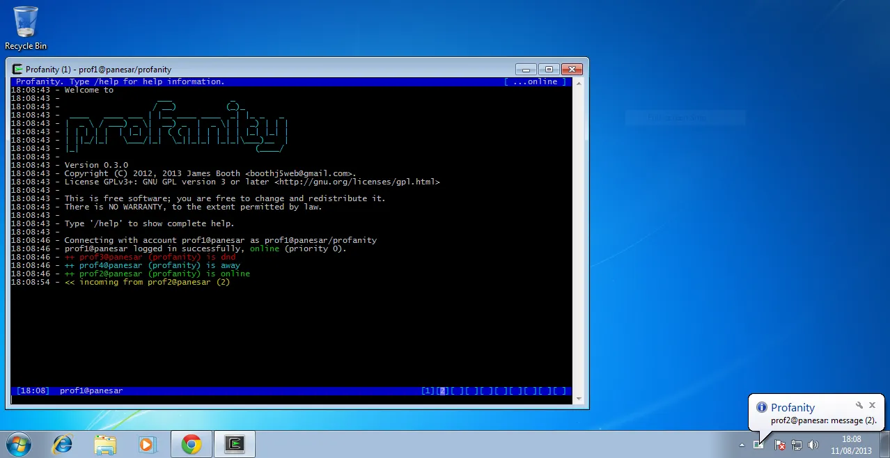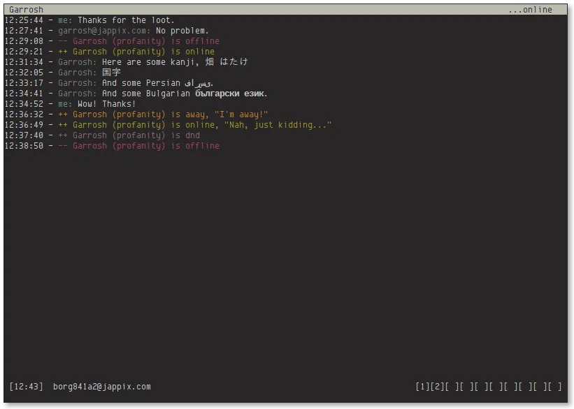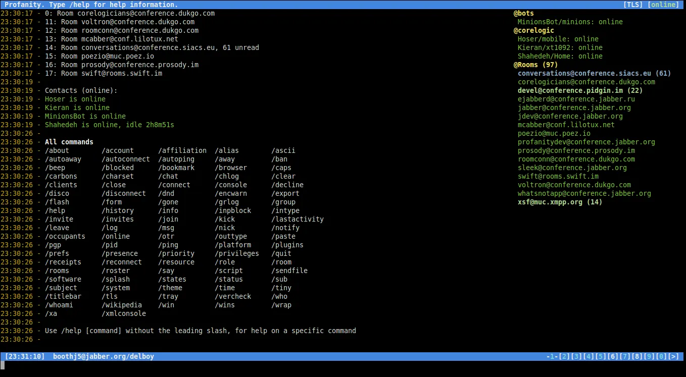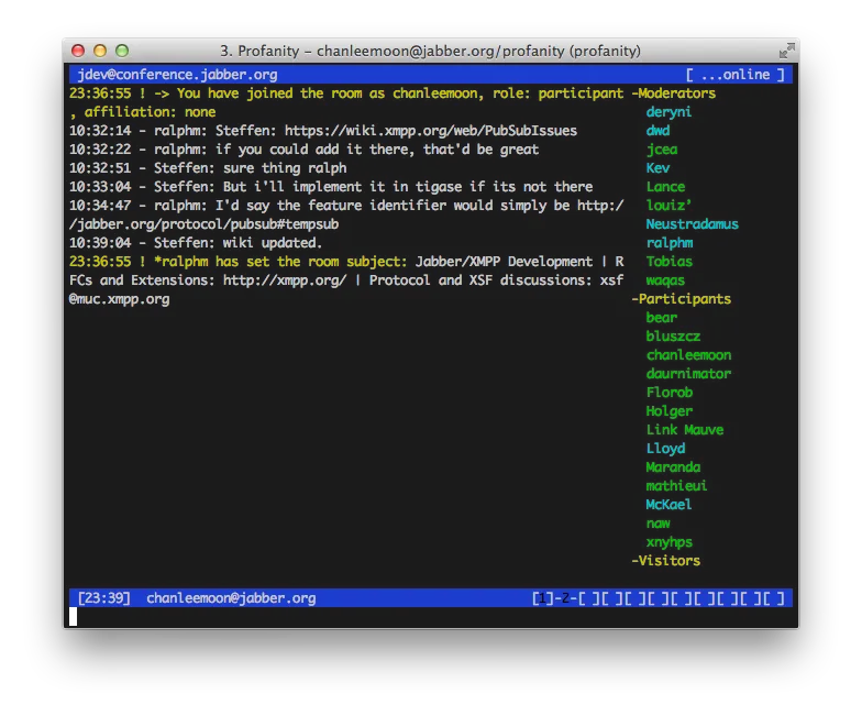 Profanity is a console based XMPP client written in C using ncurses and libstrophe, inspired by Irssi